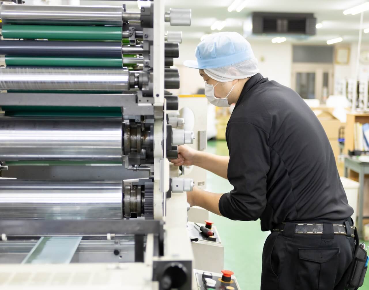 主力である5台のオフセット間欠輪転機をはじめ、310×310mmの箔押し+抜きや、1工程で2色の箔を同時に押せる加工機、シールの糊面から一部糊を隠してしまうニス塗工機など、あらゆるリクエストにお応えできる設備を取り揃えております。