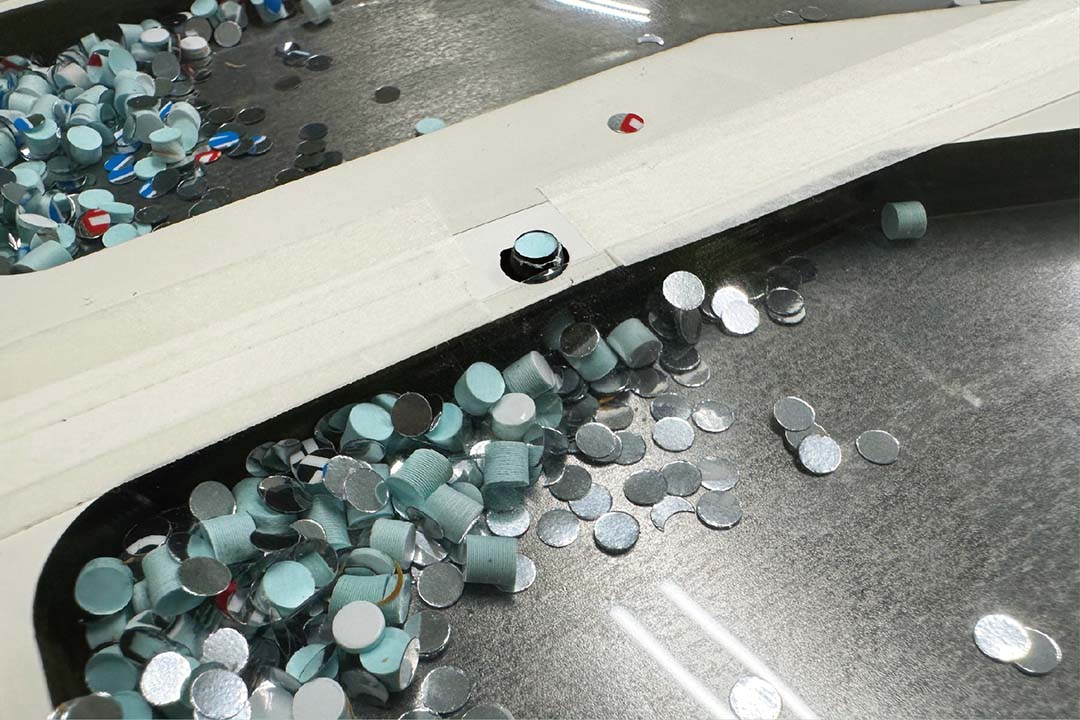 通常の刃型でもシールを打ち抜くことは出来るのですが、加工スピードが低速であることと、刃物の中にシールが詰まってしまい、大ロットになると加工効率が上がらないことがあるのです。