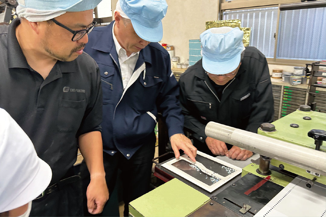 打ち抜いて刃型に詰まっていったシールが、こんな感じで刃型の内部に抜けて溜まっていくんです…これにはスタッフ一同感動。社長も会長も営業も皆集まってワイワイ盛り上がる事態となりました。笑