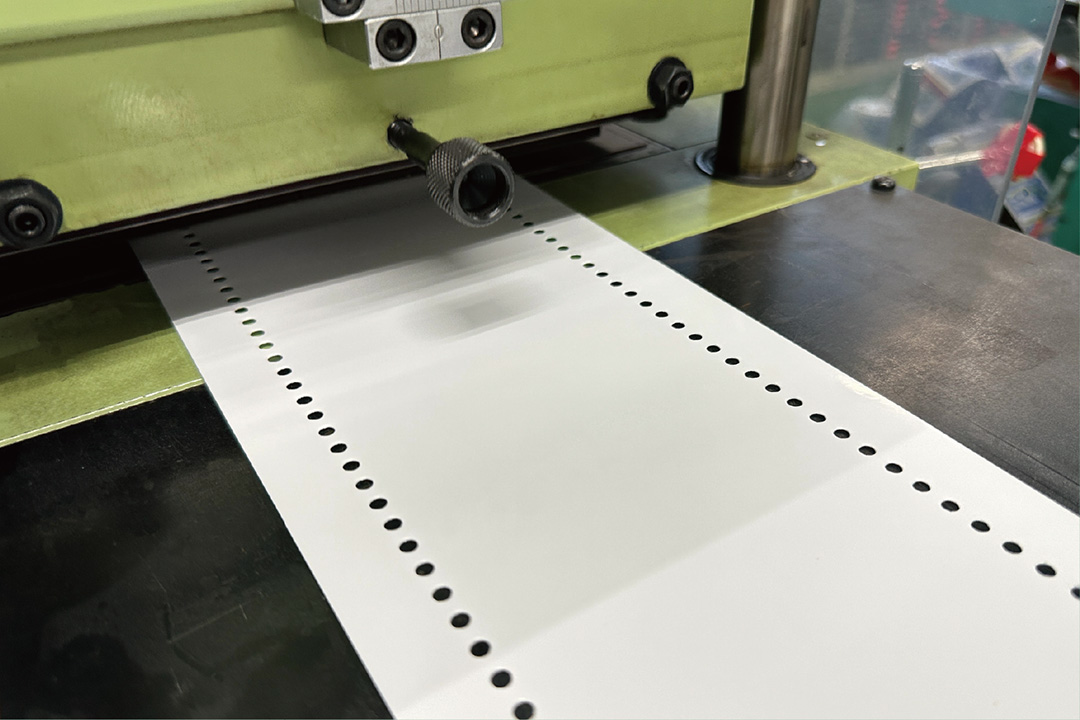 従来から得意としていた穴あけ加工ですが、今回は 株式会社フナミズ刃型製版 様が開発されたサイドポンチを使って効率化向上にトライしました。