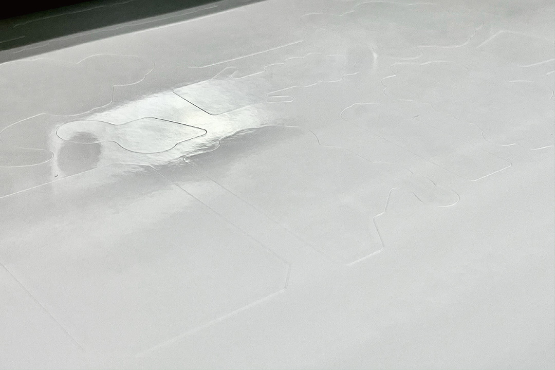 もう上層のシール材料で隠れてしまった下層の銀箔柄と位置を正確に合わせるのは中々に難しそうだった。ことある毎に全てのシールをめくり、刃物の抜け方や位置のズレをチェックしている姿に苦労が滲む。