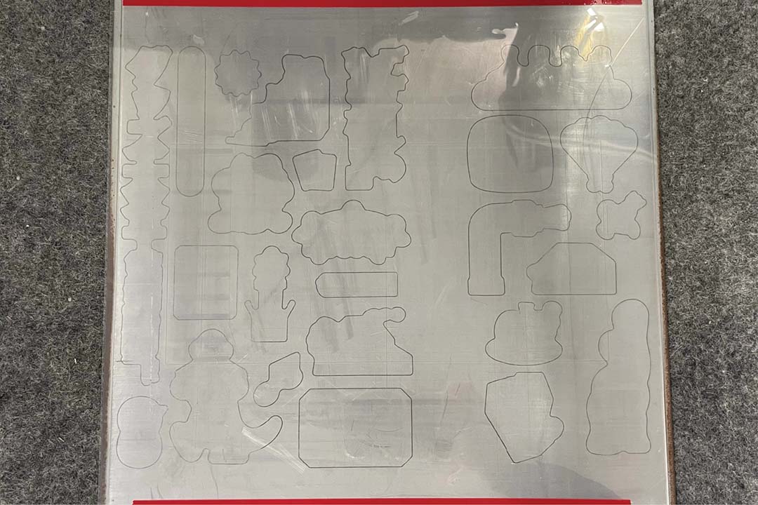 まず抜き加工の調整から。今回の刃物はくどいようだが規格外のサイズと面付けで、ここについてはメーカーさんも結構不安視されていた。今回刃型を依頼した日伸製作所さんでは、出荷する前に刃型にムラが無いかデモ加工機でテストをするのだが、今回はデモ加工機の最大サイズも超えていたため、刃型の抜きテスト無し。熟練の技術者のワザを信じる他なかったのだ。