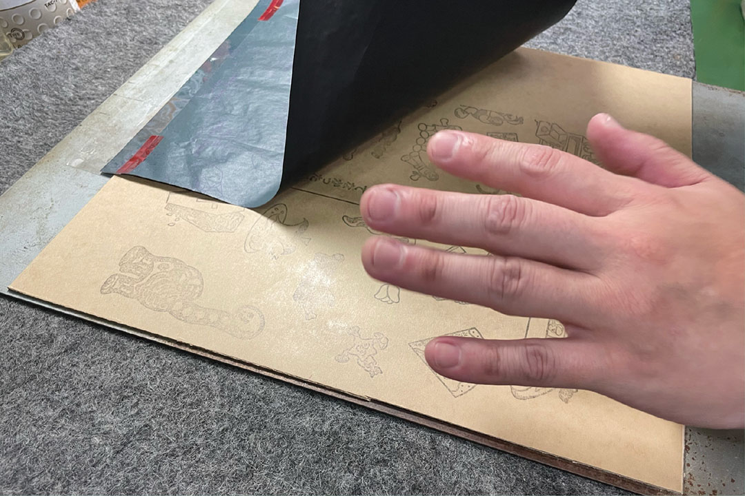 積層完了!ここまでで表紙を構成する全ての材料を貼り終えた。次はいよいよ上層の箔押しとシールをめくってもらうための抜き加工だ。
