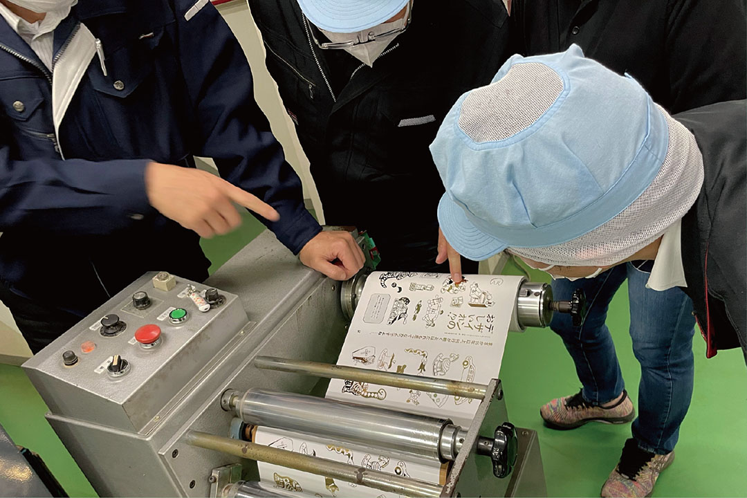 また、箔押し加工中の確認は複数の人の目ですることに。こういう自然発生的な現場同士のコミュニケーションは作業においてとても大切なのです。
