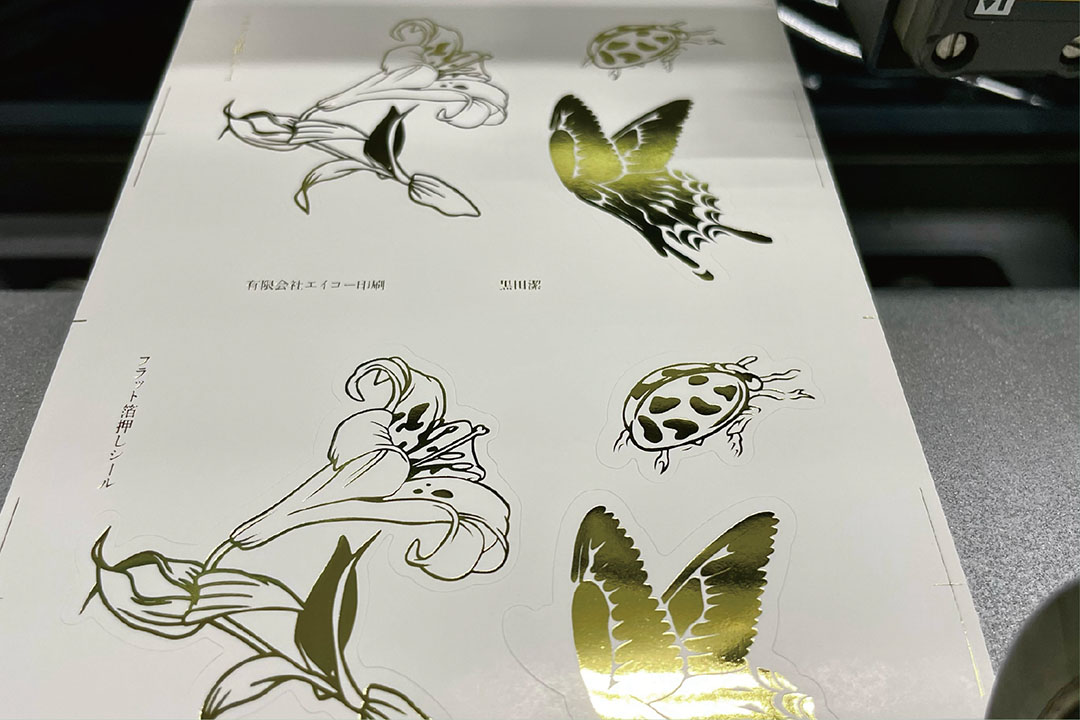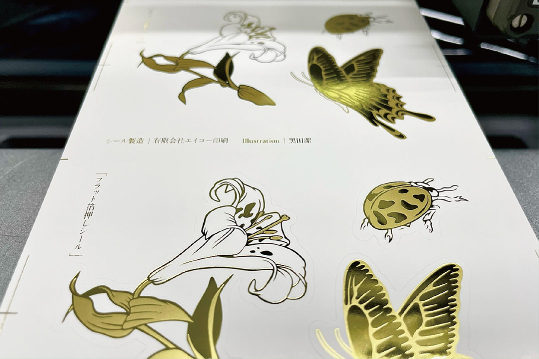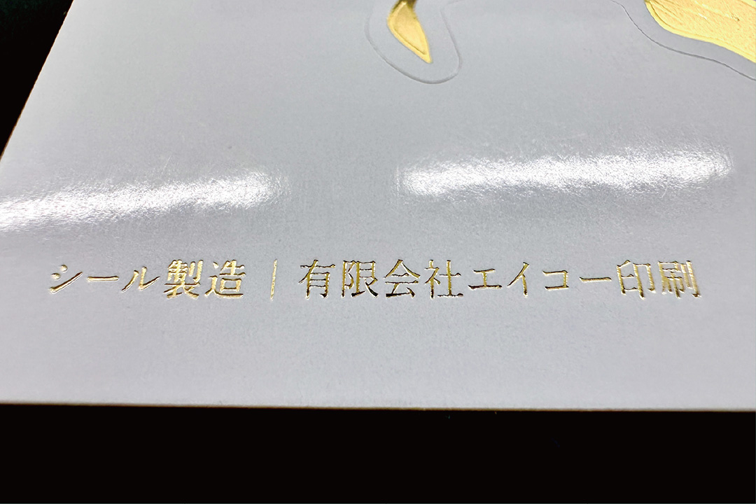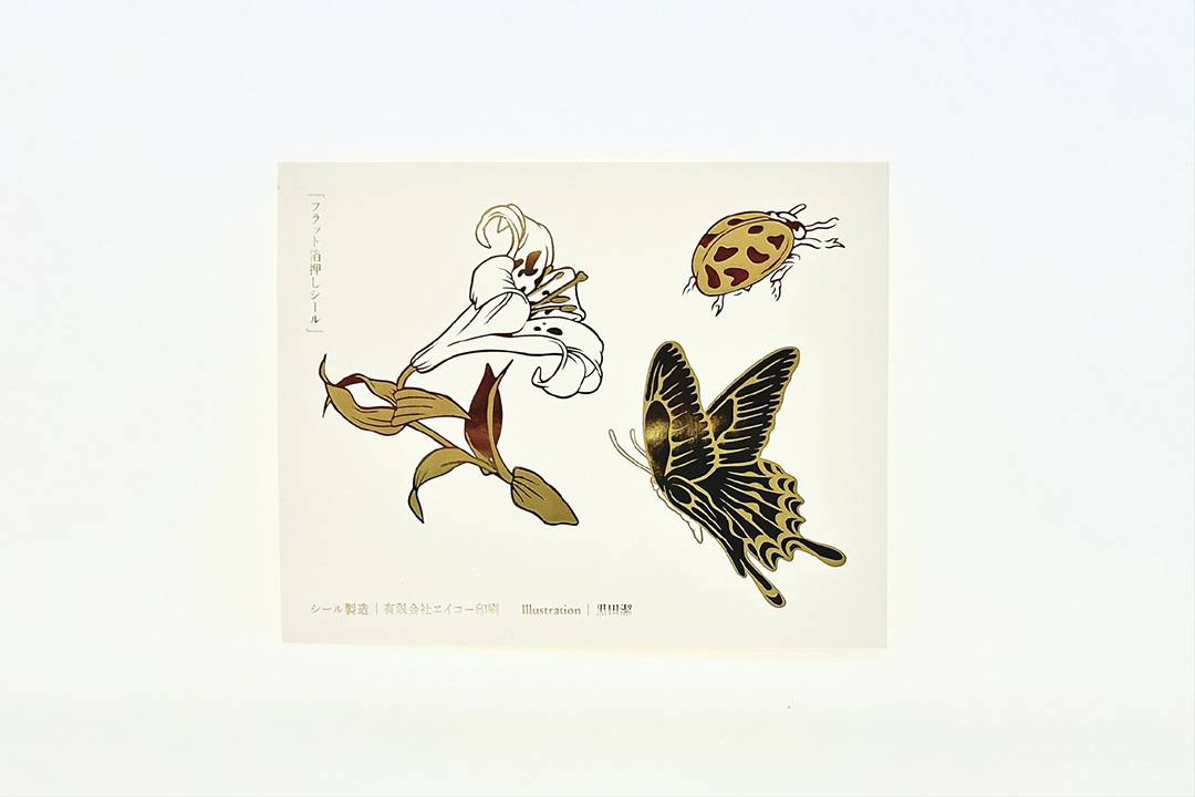 特に当社でのこだわりは文字の細かい部分まで箔押しができることが強み。今回でいえば、「フラット箔押しシール」や「黒田潔」さん、「有限会社エイコー印刷」の文字など、文字潰れせず掠れもせずはっきり箔押しされている点に注目して頂きたい。