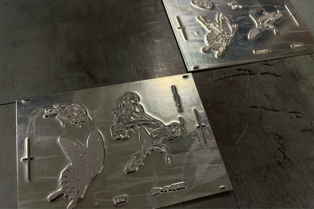 2色の箔なので版は2枚。こちらも表紙同様に当社がお世話になっているSakaePlusさんによるもの。表紙は銅板でしたが、コチラはマグネシウム版。軽くて画線がシャープに出るのが特徴。細い文字もかなりクリアに出るのだ。(弱点は耐久性。)