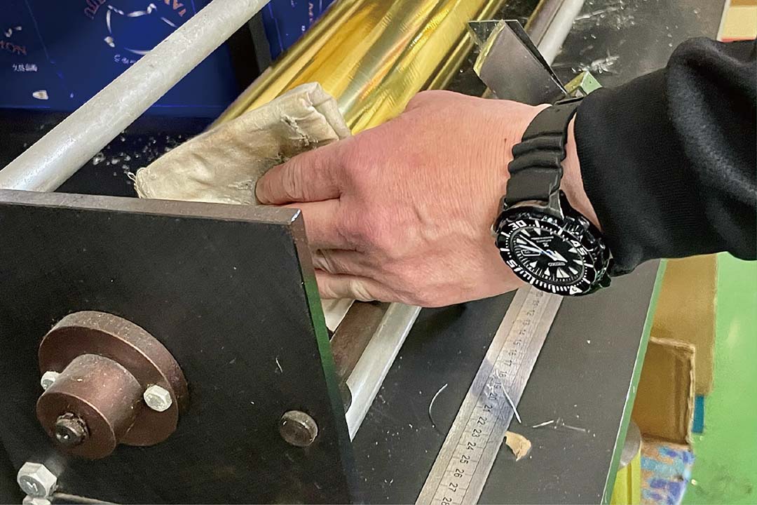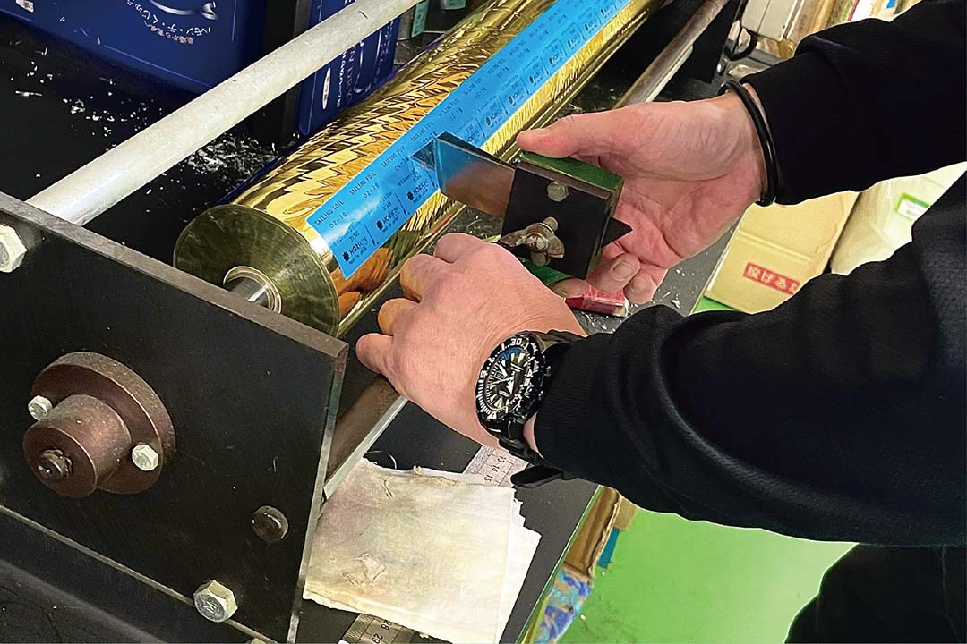 フラット箔押しシールの加工はベテラン技術者Kさんが担当。まず、箔を使用する幅にカットしてく・・・