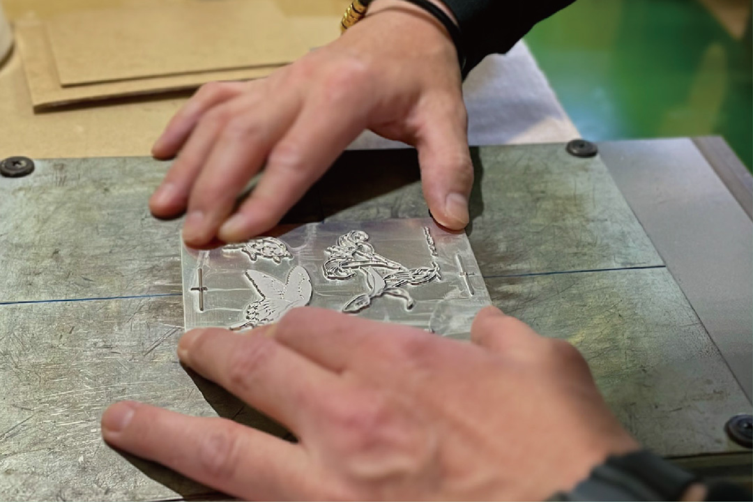 刃型と箔版の準備が整い、いざ箔押し1色目!まずは7号金箔!