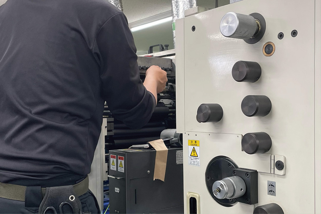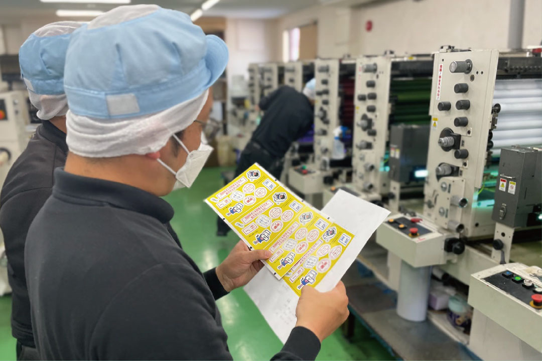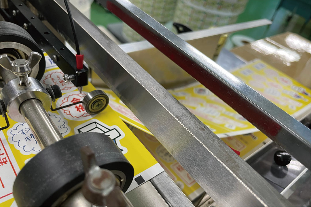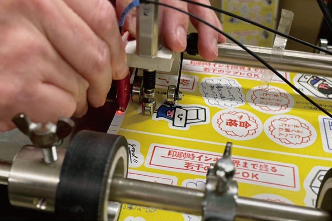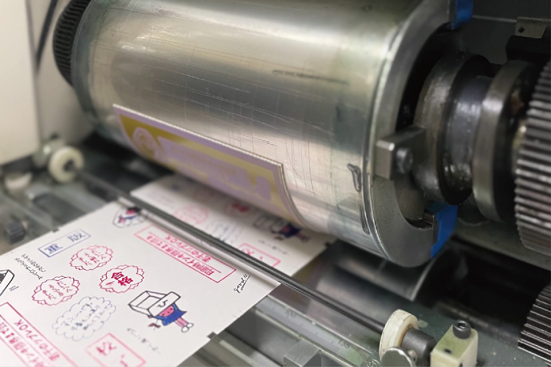 と、ゾロゾロと営業も現場も駆けつけ、印刷の様子を興味深そうに見守っている。実は、今回の「デザインのひきだし49」に掲載いただいたサンプルの中で最初に取り掛かったのが、このポストカードシール。現場も営業も社長も事務も皆珍しくワクワクしながら現場に集まってくる。