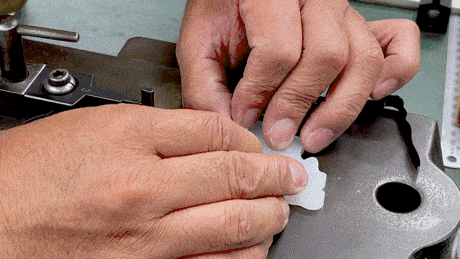 刃型の形にカットされたアクリルに沿ってゼンマイ刃がコツコツ叩かれて曲がっていきます。