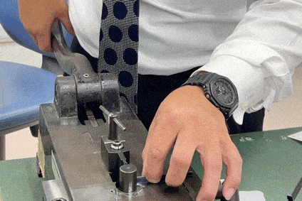 軽くレバーを落とす感覚で作っていくと教えてもらったものの、同じ治具を当てていても力の具合で曲がり方が変わったり、刃物がねじれてしまったりと技術の奥深さが感じられる体験でした。