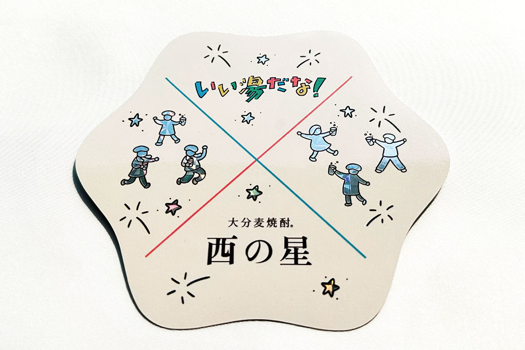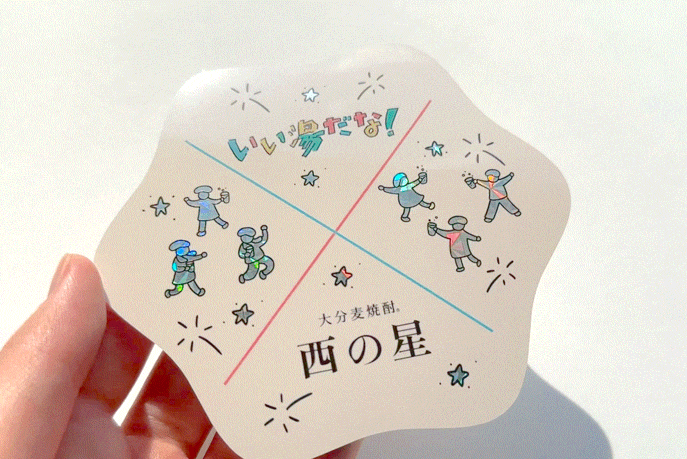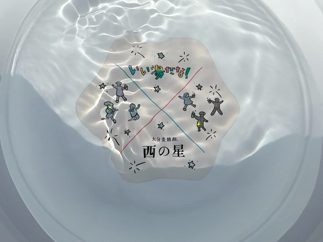 来場者に配布された湯桶の底に貼るためにつくったものですが、お湯を入れた時にキラキラとキャラクターが揺らめく効果を狙っています。