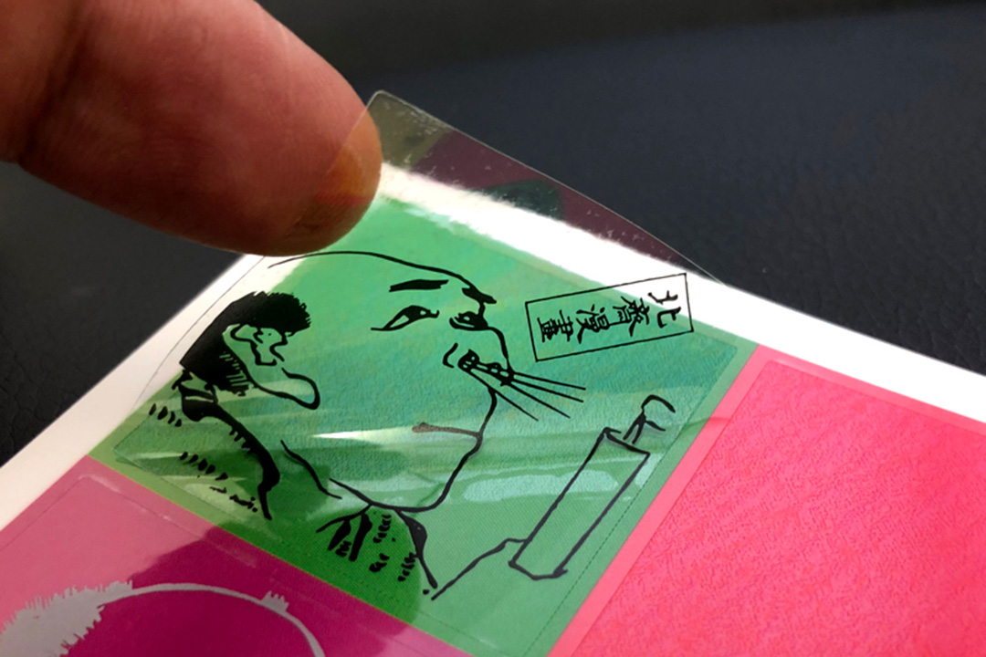 黒・金・銀で印刷された6枚の透明なシールが貼り合わされています。ちょっと遊び心があって楽しい企画ですよね。