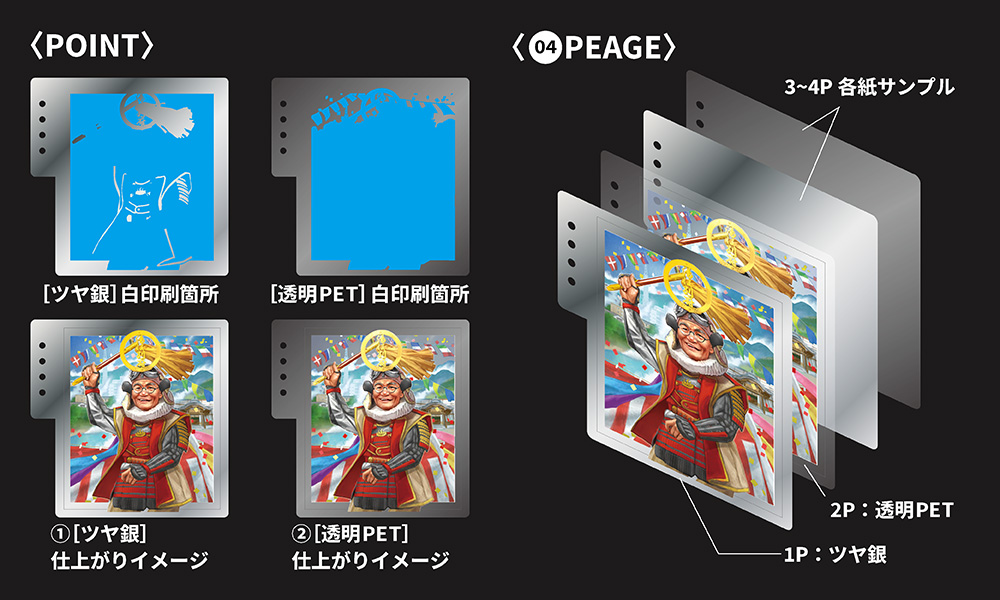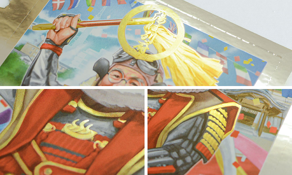 イラストの装飾など、部分的に目立たせたい箇所には白を引かず、フルカラー印刷と下地のツヤ銀を掛け合わせました。これにより金のようなメタリック(擬似金)を表現しています。