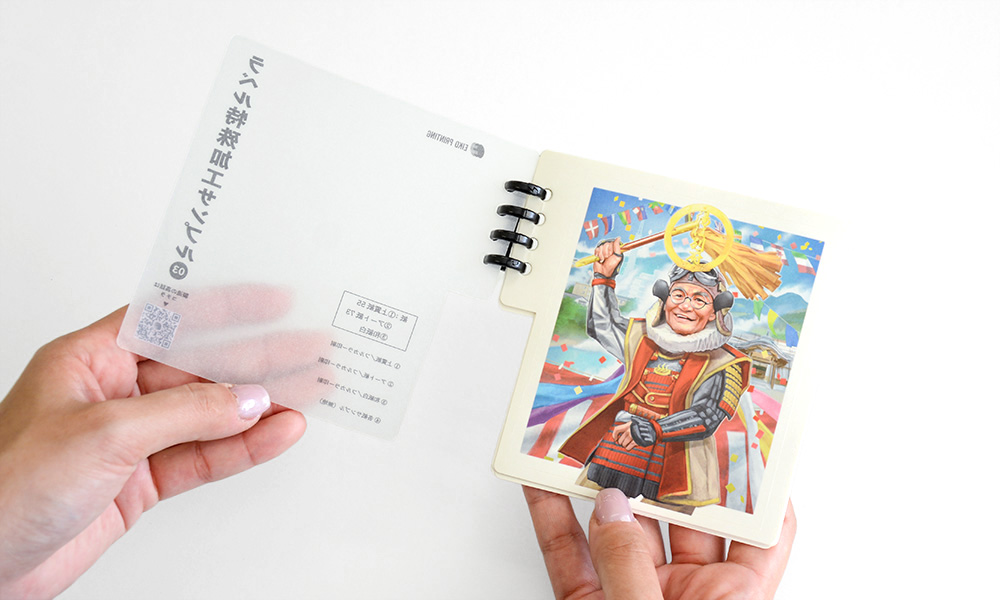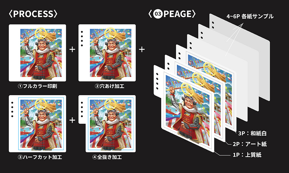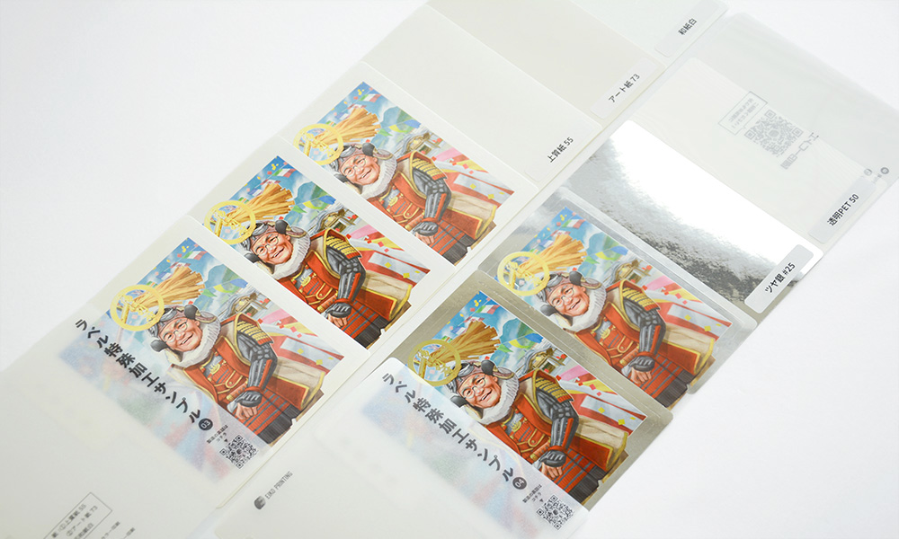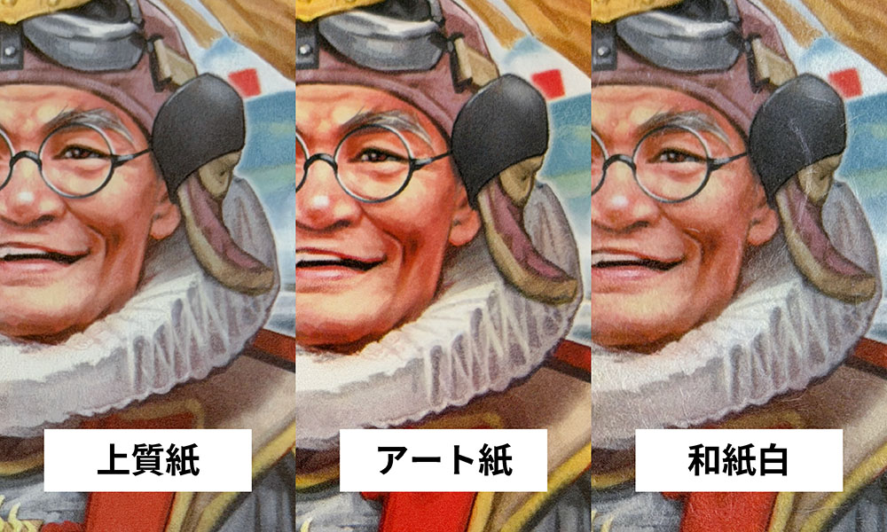 上質紙・アート紙・和紙白の3種類に、全く同じイラスト・同じ設定で印刷を行ったサンプルです。