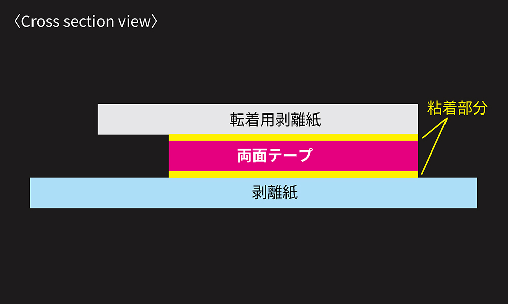 剥離紙(台紙)の上に、任意の形状にカットした両面テープを部分的に配置する「部分貼合」という特殊加工を施しています。最大の利点は、付箋のような「つまみ(持ち手)」を設けている点です。これにより、作業者が粘着面に一切触れることなく、狙った場所へスピーディーかつ精密に転着(移し替え)させることが可能になります。