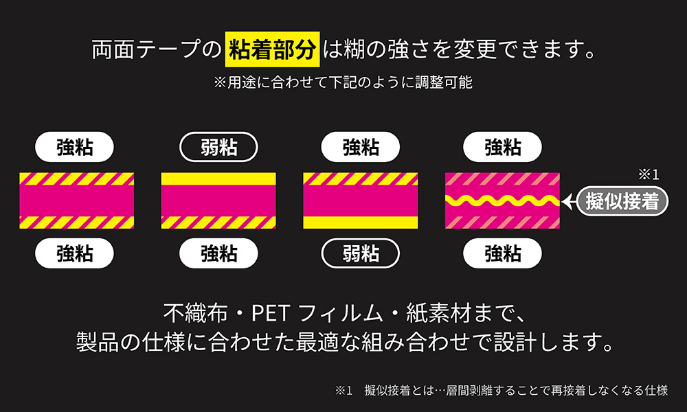 ・用途に応じた粘着剤の選定: 「強粘着×再剥離(跡が残らない)」や、一時的な固定に最適な「疑似接着」など、メーカー様の仕様に合わせた最適な粘着バランスをオーダーメイドで構築します。